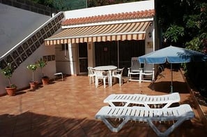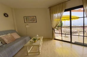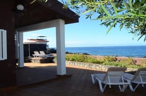 direkt am Meer, zwei Schlafzimmer, Wohnküche, Bad, Garten, Balkon, Innenhof mit Liegen, WLAN-Internet, TV.