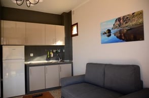 modern eingerichtete Unterkunft mit Doppelbett, Küche, Bad, in Strandnähe, Klimaanlage, WLAN, TV.
